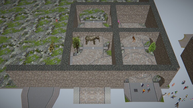 Ich habe angefangen, ein Labyrinth zu entwerfen. Der Grundriss ist fertig, dynamisch und ändert sich bei jedem Start. Ich plane es so, dass nicht alles auf einmal sichtbar ist, sondern nur 5*5 oder vielleicht 7*7 um den Spieler herum. Außerdem sind auf der leeren Grundfläche nur die bereits entdeckten Figuren sichtbar. Mein Problem damit ist, dass es nicht spektakulär genug ist. Ein großer Teil des Levels ist leer, es ist schwer zu verfolgen und nicht farbenfroh genug. Die Handlung findet jeweils nur in einem Raum statt, und dort gibt es wenig Bewegung. Außerdem muss ein Objekt, wenn es benötigt wird, entweder vorhanden sein oder man muss an der Figur der Aufgabe vorbeikommen können, sonst ist es möglicherweise unerreichbar. Wie könnte man das ändern? Hier ist ein Bild zur Veranschaulichung: