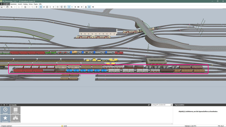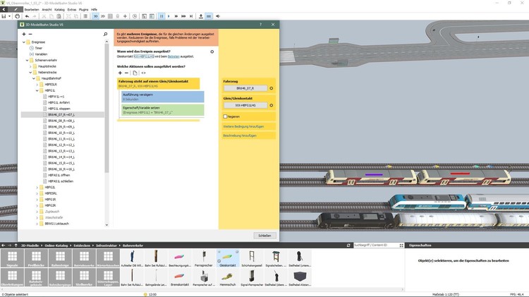 Hallo Roter Brummer, deine Mini-Experimente mit V6 sind sehr inspirierend. Habe aus deiner Mini-Anlage "ME 12 Abkuppeln einer Tenderlokomotive" das Ereignis "Kupplung lösen" in meiner Anlage in das Ereignismodul "2Schienenverkehr-Rangierbahnhof-Ablaufberg-Zug trennen eingearbeitet. Im ersten Versuch hatte ich alle Waggongruppen, die getrennt werden sollen gleich lang. Sah nicht so besonders aus. Jetzt habe ich verschieden lange Waggongruppen und einzelne Waggons zum Trennen eingerichtet. Allerdings sind es jetzt 14 Ereignisse mehr - für jede Gruppe ein Ereignis. Vielleicht geht's auch einfacher, aber dafür reichen meine EV-Kenntnisse noch nicht. Da muss ich mir bei euch Experten noch einiges Abgucken. Im Anhang habe ich mal ein paar Bilder und die Anlage im derzeitigen Entwicklungsstand mitgeschickt. Gruß Frank V6_Oberrrrroller_1_03_2.mbp