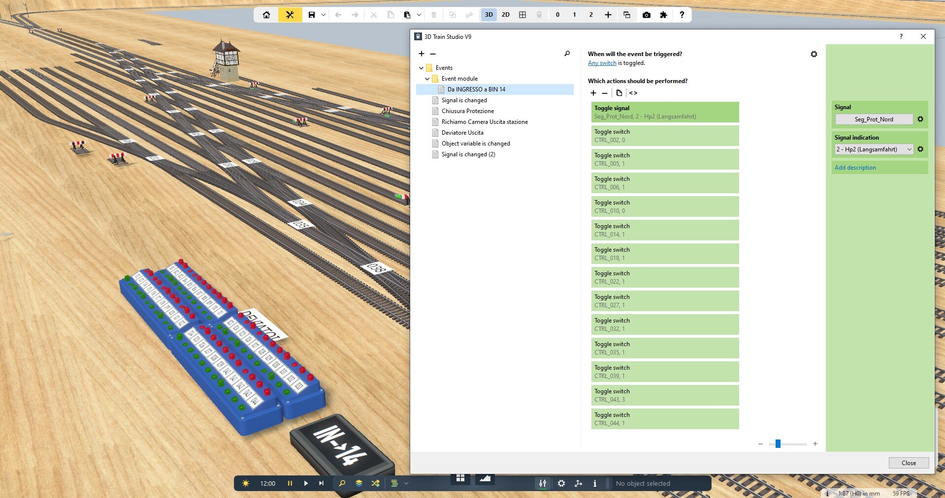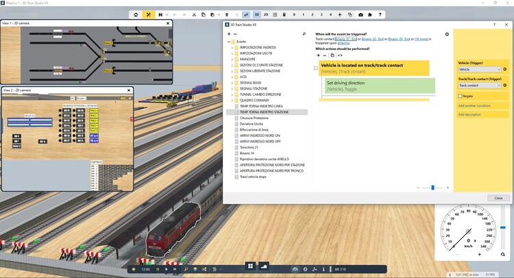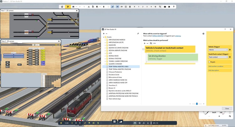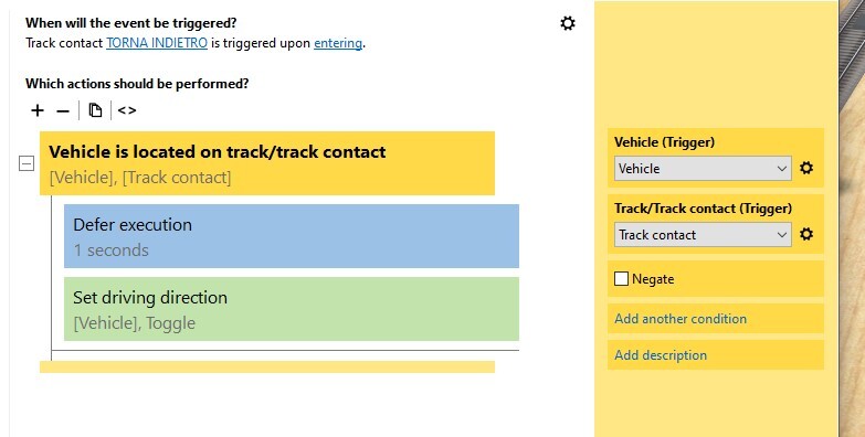 Guten Abend, ich habe das Problem, das ich im Betreff beschrieben habe ... Für das Layout, das ich baue, basierend auf einem Kopfbahnhof, ist es unerlässlich, dass ein Zug, wenn er am Ende des Gleises ankommt, die Richtung wechselt, um bereit für die Abfahrt in die entgegengesetzte Richtung zu sein. Ich habe einen "Kontakt" am Gleisende und einen Kontakt entlang der Strecke platziert (um einen Test zu machen). Eine einzelne Lokomotive funktioniert perfekt ... jedes Mal, wenn sie einen "Kontakt" berührt, wechselt sie die Richtung ... aber ein Zug, bestehend aus einer Lokomotive und Waggons, tut es nicht! ... Er kommt am Gleisende an und stoppt! ... fährt nicht in die entgegengesetzte Richtung zurück! Das bereitet mir Schwierigkeiten ... weil ich die Züge nicht "berühren" und sie "von Hand" starten lassen kann ... es ist wichtig, dass sie "immer" startbereit sind und ich mich nur darauf beschränke, das Ausfahrsignal zu öffnen, wenn sie abfahren können. Ich habe auch versucht, den Kontakt am Ende des Gleises zu verschieben, ich dachte, er würde den Kontakt nicht "erreichen"/"erfassen" ... aber das Problem tritt auch bei dem Streckenkontakt auf! ... Es überfährt ihn ruhig, als ob der Kontakt überhaupt nicht existieren würde! Zu den beiden Bildern ... das erste Bild, um Ihnen zu zeigen, wie ich den Kontakt entlang der Strecke programmiert habe ... Ich glaube, ich habe ihm gesagt: 'Wenn ein Zug den Kontakt "TORNA INDIETRO" berührt, wechselt die Fahrrichtung'. Auf dem zweiten Bild die gleiche Ereignisprogrammierung, die für die Kontakte an den Gleisenden eingestellt ist ... und der rote Wagen (BR 218), den Sie hervorgehoben sehen, ist angekommen, hat angehalten und hat nichts anderes getan! ... Er hätte stattdessen in die entgegengesetzte Richtung abfahren sollen! Ich glaube nicht, dass ich die Programmierung falsch gemacht habe, weil, ich wiederhole, eine einzelne Lokomotive einwandfrei funktioniert ... jedes Mal, wenn sie einen dieser Kontakte berührt, wechselt sie die Richtung, bis ich sie anhalte ... Aber dieser Zug ... reagiert nicht auf diese Kontakte ... Ich verstehe nicht, wo der Fehler liegen könnte ... Haben Sie Vorschläge? Vielen Dank an alle.