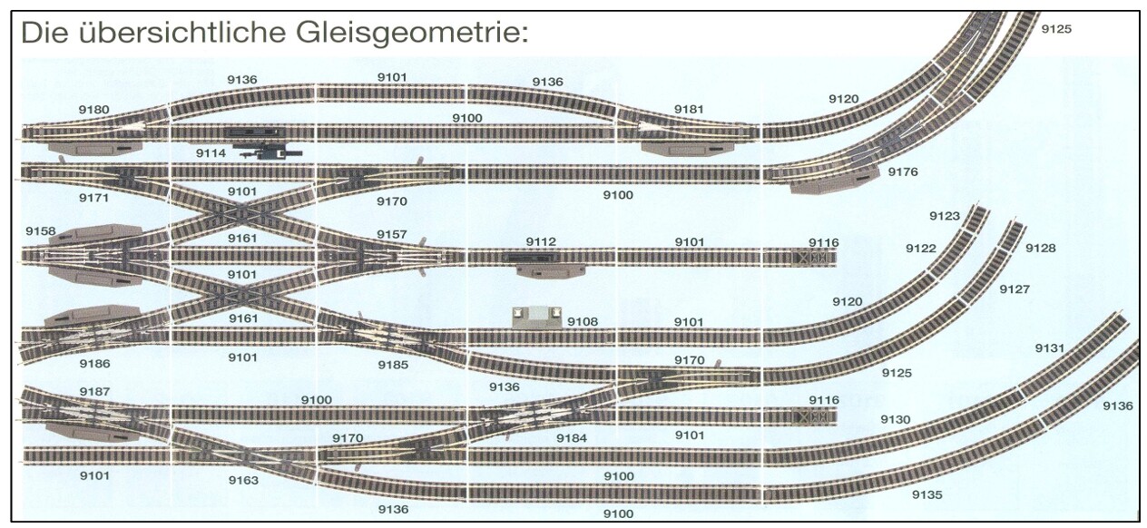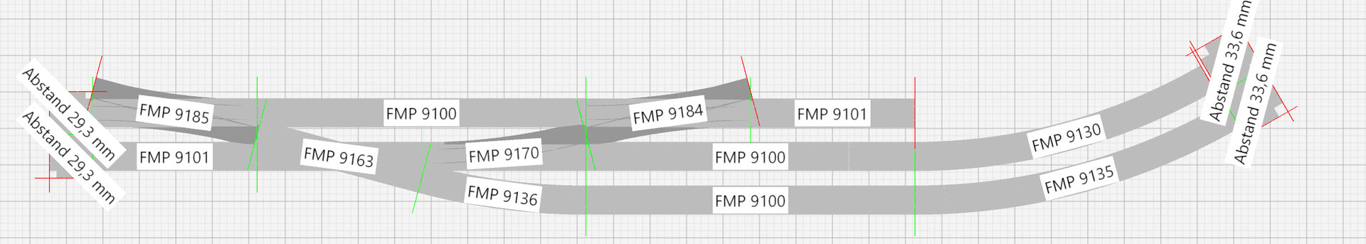 wenn die 9130 und die 9135 parallel zu einander laufen, so das diese nach einer 180° Anordnung gleichzeitig enden, dann ergibt sich ein Abstand von 33,6 Millimeter (das passt auch so im Programm). Aus den Weichen im Programm ergibt sich aber immer ein Abstand von 29,3 Millimetern. Ergo funktioniert es nicht. Ich kann also nicht weiter planen, de es sich nie ausgeht. Ich bin verzweifelt und weiß nicht woran es liegt und wo der Fehler ist.