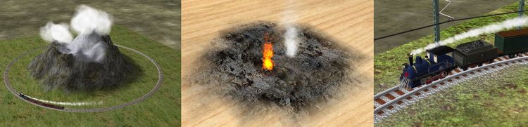 Hallo, mit der aktuellsten Version des 3D-Modellbahn Studio Professional steht ein neuer Objekttyp zur Verfügung, der eine völlig neue Form der Modellbahnsimulation ermöglicht, die Partikeleffekte. Partikeleffekte sind technisch betrachtet eine Menge von texturierten Punkten, die speziell animiert werden, sodass dynamische Objekte dargestellt werden können. Im folgenden Bild seht ihr ein paar Beispiele für mögliche Partikeleffekte: Auf den Bildern sind verschiedene Effekte dargestellt, wie z.B. Wolken, Schneefall, Wasserdampf von Dampfloks, Feuer und Rauch. Dies ist jedoch nur eine Auswahl von Möglichkeiten. Jeder Besitzer der Professional-Version kann eigene Partikeleffekte definieren und konfigurieren. Dafür gibt es im Menü unter "Katalog - 3D-Modelle - Neu - Partikeleffekt" ein neues Konfigurationsfenster: Die Anzahl der Einstellungsmöglichkeiten scheint auf den ersten Blick sehr komplex, bietet am Ende aber eine große Flexibilität um alle möglichen Formen von Partikeleffekten abzubilden. Im folgenden möchte ich die Konfigurationsoptionen erläutern: Emitter-Typ: Gibt die Form des Partikelsystems an, d.h. den Bereich in dem neue Partikel erzeugt werden. Dieser kann z.B. quaderförmig, zylinderförmig oder kugelförmig sein. Wird ein neuer Partikel erzeugt, wird seine Position zufällig im angegebenen Bereich festgelegt. Emitter-Größe: Gibt die Größe des Emitters an, abhängig des gewählten Typs. Partikelanzahl: Gibt die Gesamtanzahl aller Partikel pro Effekt an. Je höher die Anzahl, um so realistischer wirkt der Effekt typischerweiße. Beachtet jedoch, dass eine hohe Partikelanzahl auf Lasten der CPU und Grafikkarte geht. Versucht daher die Anzahl soweit wie möglich zu minimieren. Partikeltyp: Legt die Bewegungsform der Partikel fest. Dynamische Partikel besitzen eine Geschwindigkeit und eine "Lebensspanne". Ist diese beendet, wird der Partikel an einer neuen Position erzeugt. Statische Partikel besitzen keine Lebensspanne oder Geschwindigkeit und verändern sich daher nicht (z.B. Wolken oder Nebel). Startgröße: Gibt die minimale und maximale Größe eines neuen Partikels an. Der tatsächliche Wert wird per Zufall in diesem Bereich ermittelt. Je größer der Bereich, desto unterschiedlicher sind die Partikel. Die folgenden Einstellungen gelten nur für dynamische Partikeleffekte: Lebensdauer: Gibt die minimale und maximale Lebensdauer eines einzelnen Partikels in Sekunden an. Der tatsächliche Wert wird per Zufall in diesem Bereich ermittelt. Endet die Lebensspanne eines Partikels, wird dieses an der Startposition erneut mit neuen Zufallswerten generiert. Minimale Geschwindigkeit: Gibt die Mindestgeschwindigkeit eines Partikels in alle 3 Richtungen an. Maximale Geschwindigkeit: Gibt die Höchstgeschwindigkeit eines Partikels in alle 3 Richtungen an. Die tatsächliche Geschwindigkeit liegt zwischen der minimalen und maximalen und ändert sich im Leben eines Partikels nicht. Wachstumsgeschwindigkeit: Gibt die Geschwindigkeit der Größenänderung eines Partikels pro Sekunde an. Negative Werte lassen das Partikel im Laufe der Zeit schrumpfen, positive Werten vergrößen das Partikel. Drehgeschwindigkeit: Gibt die Rotationsgeschwindigkeit eines Partikels an. Neben den grundlegenden Eigenschaften wie der Startgröße, der Geschwindigkeit und der Lebensspanne eines Partikels üben die Materialeigenschaften einen großen Einfluss auf den Effekt aus: Textur: Gibt die Textur an, die für jeden Partikel genutzt werden soll. Im Katalog gibt es bereits in der Kategorie "Material" eine Auswahl von Partikeltexturen. Startfarbe mit Transparenz: Gibt die Farbe sowie die Transparenz des Partikels zu Beginn seines Lebens an. Zielfarbe mit Transparenz (nur dynamische Partikel): Gibt die Farbe sowie die Transparenz des Partikels am Ende seines Lebens an. Während des Partikellebens wird die tatsächliche Farbe und Transparenz zwischen der Start- und Zielfarbe interpoliert. Leuchtpartikel: Gibt an, ob die Partikel leuchten. Leuchtende Partikel (wie z.B. Feuer) werden nicht vom Licht der Anlage beeinflusst. Leuchtende Partikel besitzen keine Transparenzen, da die Farbe allein über das Aussehen entscheidet, d.h. ein schwarzes "Leuchtpartikel" ist nicht sichtbar, ein weißes "Leuchtpartikel" enthält hingegen die hellste Farbe. Partikeleffekte sind ein eigenständiger Objekttyp, der beliebig auf der Anlage platziert werden kann. Weiterhin sind folgende Operationen möglich: Verknüpfung mit anderen Objekten, um den Effekt z.B. an eine Lok zu binden. Verknüpfung mit einem Schalter oder einem Ereignis, um den Effekt ein- oder auszuschalten. Zusätzlich zu den eigenständigen Objekten können Partikeleffekte auch Teil von Lokomotiven sein, um Wasserdampf abzubilden. Dafür gibt es im Rollmaterial-Editor ein neues Feld "Dampfpartikel". Wichtig: Dieses Feld steht nur für Loks und nur für Modelle zur Verfügung, die ein Unterobjekt mit dem Namen "_PEP" (Particle Emitter Position) besitzen. Das spezielle Unterobjekt gibt die Position des Wasserdampfs an. Jeder Loktyp kann eine eigene Version eines Partikeleffekts bekommen. Besitzt eine Lok einen Effekt, so wird dieser automatisch aktiviert oder deaktiviert, je nachdem ob die Lok fährt oder nicht. Und nun viel Spaß mit den neuen Partikeleffekten. Ich bin gespannt auf eure Ideen. Versucht an den Einstellungen zu drehen, gebt den vorhandenen Partikeln eine andere Farbe oder Textur und ihr werdet sehen, dass teilweise völlig neue Effekte entstehen. Ersetzt den Schnee durch eine Laubtextur und ihr könnt im Herbst das Laub von eurer Anlage kehren . Viele Grüße, Neo