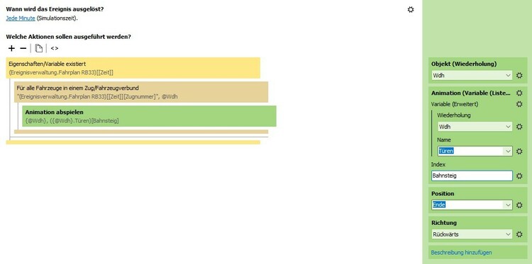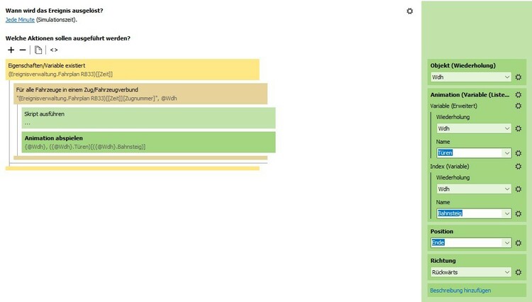 Werde ich ausprobieren und mir im praktischen Beispiel mal ansehen müssen. Bislang ist mir noch nicht klar bewusst, wann ein Zug auf einem Gleiskontakt steht wenn dieser gestoppt ist. Zeitgleich könnt ihr mir vielleicht beim umgekehrten Problem ebenfalls helfen, dem schließen der Türen und anschließendem Abfahren. Dazu habe ich eine globale Variable als Tabelle als Fahrplan erstellt. Jeder Zeiteintrag hat wiederum selbst eine Tabelle mit verschiedenen Variablen wie Ziel, Zugnummer etc. (siehe Screenshot Fahrplan) Da ich in dem Moment ja keinen Zug als Auslöser habe, beinhaltet die innere Tabelle die Zugnummer, welche gleichlautend ist wie die beiden Triebwagen. Mein Versuch geht insoweit, dass ich über das abfragen der Zeit (Lösung in anderem Thread) auf die Zugnummer der inneren Tabelle zugreife und diese als Fahrzeug/Objekt in meinem "Animation abspielen"-Aufruf verwende. Die Animationsnamen stehen in einer Objektvariablen "Türen" des Triebwagens in einer Tabelle mit dem Index "Links/Rechts", welcher wiederum ebenfalls aus einer Objektvariabelen des Triebwagens "Bahnsteig" entnommen wird. Da das ganze natürlich für den gesamten Zugverbund durchgeführt wird, ist es in einer entsprechenden Wiederholen-Funktion eingeschlossen. Leider werden aber immer alle Animationen abgespielt anstatt nur die der Türen und ich finde den Denkfehler nicht.