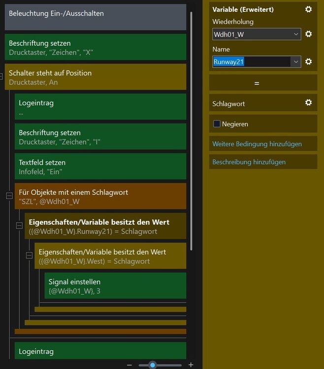 Hallo, irgendwie stehe ich grade auf dem Schlauch. Ich bin mir eigentlich zu 100% sicher das es geht, finde aber keinen vernünftigen Ansatz um Objekte die mehrere Schlagwörter gemein haben anzusprechen. Alle Modelle haben ein Schlagwort für die Startbahn wie z.B. Runway21 Alle Modell haben zusätzlich ein Schlagwort für die Startrichtung wie z. B. West oder Ost Alle Modell haben ein Schlagwort für den Wirkbereich z. B. RL (Runway Light), SZL (StartZone Light), TOAL (TakeOff Area Light) Ich möchte z. B. alle Seitenleuchten im 1. Drittel der Landebahn 21-W ansprechen ohne die der Landebahn 21-O oder der Landebahn 22 anzusprechen. Die entsprechenden Leuchtwürfel haben alle folgende Schlagwörter: Runway 21, West und RL Ich stelle ja mit Signal in einer Wiederholung alle Leuchtwürfel mit EINEM Schlagwort um, doch dabei werden dann alle anderen Landebahnen mit angesprochen. Muss ich die vorher noch in einer Bedingung ausschließen? Wenn ja wie ? Eigenschaft/Variable besitzt Wert, oder was genau?