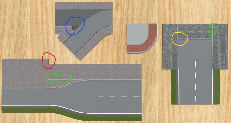 @Jim Knopf Hallo, ich finde deine Bürgersteige sehr gut und nutze sie quasie an jedem Strassenelement. Finde ich viel effektiver als die Bürgersteige im Modell. Allerdings sind mir ein paar Dinge aufgefallen, die du dir vielleicht mal ansehen könntest. Dazu habe ich einen Screenshot mit angehangen. Mir ist nicht klar nach welchem Maßstab die beiden Breiten der Bürgersteige konzipiert sind. Basiert die Breite auf Normen? Hintergrund der Frage ist der Versatz im rot Markierten Bereich auf dem Screenshot. Wenn es frei definierte Breiten sind könnte man vielleicht den schmalen oder den breiteren Bürgersteig so anpassen, dass sie in dem gezeichten Fall eine Flucht ergeben. Dann könnte man solche Verbreiterungen direkt mit einem "geraden" Bürgersteig durchbauen. Es gibt ja für Kreuzungen den Bürgersteig mit Außenradius. Abgesehen davon, dass man ihn eventuell für einspurige Strassen zusätzlich mit einem kleineren Radius gebrauchen könnte ist der perfekt. Allerdings fehlt mir immer wieder das Gegenstück dazu. Also eine Ecke mit der innengelegenen Strassenkante. Das kann man zwar wie auf dem Bild im gelben Bereich mit den geraden Teilen selbst zusammen bauen, doch ist es immer eine Frimelei das genau hinzubekommen und zusätzlich hat man immer das Problem, dass die Strassenkante in eine Richtung eine Überlappung hat und immer aufflimmert solange man nicht einen Bürgersteig minimal in der Höhe anpasst. Eine fertige Ecke wäre da die bessere Lösung. Außerdem s fehlt mMn ein Bürgersteig ohne die Strassenkante um solche Überlappungen wie im grünen Bereich gezeigt zu vermeiden. Natürlich kann man auch hier mit der Höhe spielen, doch wenn man mehrere Bürgersteigeüberlappen hat, die sich Überlappen wird es irgendwann schwer eine passende Kombination zu finden. Außerdem könnte so ein Bürgersteig auch einfach als Erweiterung der anderen Bürgersteige benutzt werden und so einen noch breiteren Bürgersteig darstellen. Zuletzt wäre ein "schmalerer" Bürgersteig schön damit solche kleinen Ecken wie im blauen Bereich sichtbar besser gelöst werden können. Klar wird es ohne Radius nie eine perfekte Lösung geben, doch je schmaler der Bürgersteig desto eckiger könnte man werden. Vielleicht ginge ja sogar ein spitzt zulaufender Bürgersteig, keine Ahnung. Zur Vereinfachung der Verwendung würde ich mir ggf. mehr Kontaktpunkte wünschen. Also nicht nur zu den Strassen (vielleicht ja anpassbar zu den verschiedenen strassenbreiten), sondern auch zu den Bürgersteifen untereinander selbst. Vielleicht hast du ja Lust und Zeit die Modelle zu überarbeiten. ESie können nur noch besser werden als sie eh schon sind.