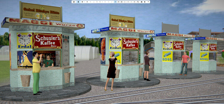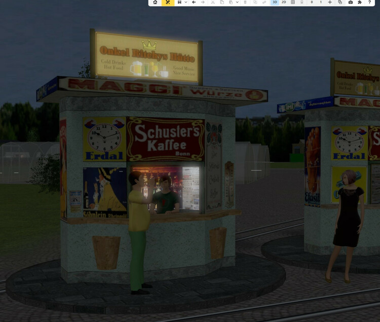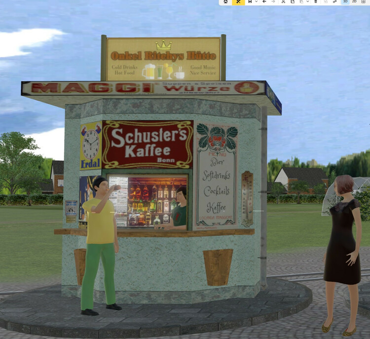 Hallo und guten Tag in die Runde. Wie ich ja schon in meinem ersten Beitrag angedroht habe, will ich virtueller Modellbauer werden. Nach unzähligen Stunden Bastelei habe ich es tatsächlich geschaft etwas eigenes auf meine Anlage zu bringen. Ein winziger Schritt für die Gemeinschaft aber ein großer für mich. Es ist kleines Modell von einem Kiosk. Vorbild ist ein Kartonmodellbaubogen der auf meiner Festplatte schlummert. Diesen habe ich als Grundriss und Seitenansicht in Blender eingefügt und angefangen zu modellieren. Mannomann, was ein gefummel. Nebenbei habe ich mit Gimp eine Multitextur erstellt. Das fällt mir bedeutend leichter und war schnell erledigt. Aber dann das Texturieren des Modells. Eine mühselige Angelegenheit. Aber Egal, es kann nur besser werden. Jetzt möchte ich hier gerne ein Bild einstellen um euch zu zeigen was ich bisher verbrochen habe, aber ich weiß nicht wie das geht. Ah, geht doch. Ihr reibt euch jetzt wahrscheinlich verwundert die Augen und denkt: Das will er doch nicht im Ernst in den Katalog hochladen? Nein, den Anspruch habe ich nicht. Ich sehe es in erster Linie als Übung. Es hat noch viele Fehler, die Texturierung ist nicht schön und die Dateien sind zu groß. Wobei das Studio grünes Licht für den Import gegeben hat. Leider komme ich nicht so recht weiter. Z.B. bei der Texturierung: Die Skalierung der Betonsteine auf der runden Bodenplatte ist viel zu groß. Im Original eher 10x20 cm. Auf meiner Multitextur habe ich einen Bereich von 256 x 256 px mit einer nahtlosen Betonsteintextur. Wie kann ich Blender dazu überreden diese Textur mehrfach gekachelt auf die Bodenplatte aufzutragen? Oder geht das nicht und ich muß die Bodenplatte segmentieren? Wenn mir da jemand einen Tip geben könnte in welche Richtung ich denken sollte? Was mir auch noch aufgefallen ist: Links neben Achim kann ich durch die Hütte schauen und sehe das Kopfsteinpflaster im Hintergrund. Da muß ich nochmal ran. So, ihr Lieben, das war es vorerst. Die Sonne scheint. Es ist Biergartenwetter. Grüße, Dirk