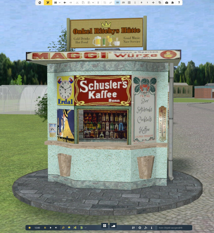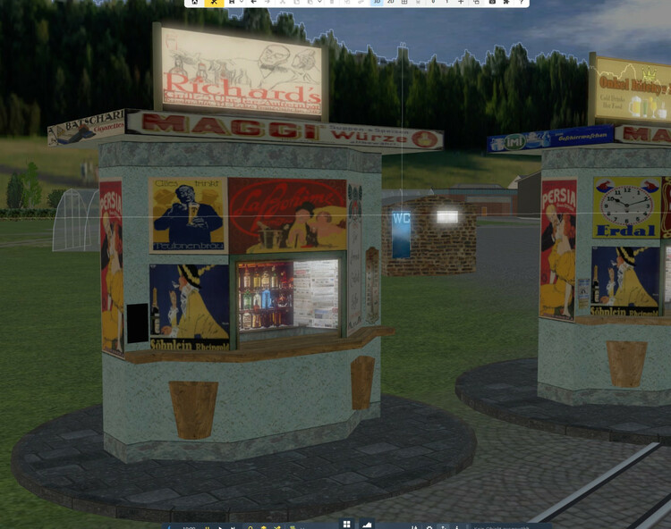 Hallo und guten Abend in die Runde. Ich möchte euch kurz meinen Fortschritt mit meinem kleinem Kiosk zeigen: Rechts das Modell wie ich es am Anfang vorgestellt habe. Links die neuste Version. Noch lange nicht perfekt, aber ich merke, das ich mit Blender langsam warm werde und meine Mausklicks immer schneller ihr Ziel finden. Das macht Spass. Nebenbei arbeite ich mit GIMP an der Multitextur (1024x512px) um soviele Pixel wie möglich auszunutzen. Daraus entwickelt sich nach und nach eine Multi-multi-textur, mit der ich zwischen verschiedenen Styles umschalten kann.. Dazu habe ich eine Frage: Was muß ich machen um eine zusätzliche Variante der Textur hochzuladen? ( Um Z. B. die englischen oder französischen Freunde mit passenden Werbeplakaten zu versorgen) Ist das dann eine Tauschtextur? Und wenn ja, wie kann ich sie euch zur Verfügung stellen? Aber hier erst mal ein Bild: Bis bald und freundliche Grüße Dirk
