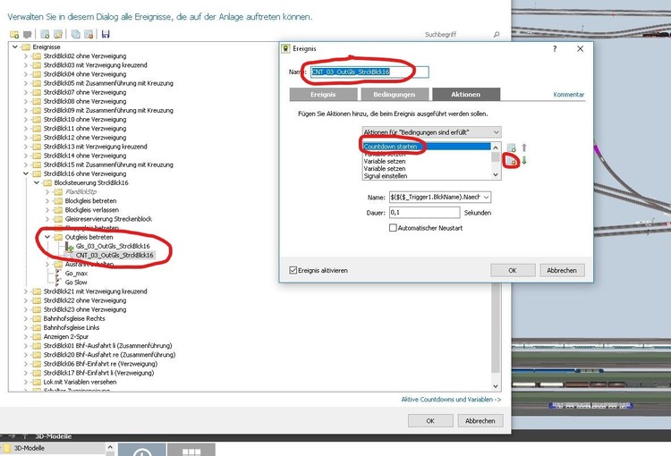 Hallo zusammen, zunächst erst einmal vielen Dank für eure Hilfe. Ihr habt alle das Problem richtig gesehen. Es liegt an einer 2. Weichenschaltung die fälschlicher Weise beim Betreten des grünen Outgleises, das die BR 05-003 betritt, ausgelöst wird. Durch mehrmaligen Umstrukturierung habe ich im StrckBlck16 in der Gruppe "Outgleis betreten" beim Countdown (CNT) in den Aktionen vergessen die Weichenschaltung für den nächsten Block zu löschen. Dieser CNT ist nuer erforderlich, wenn nachfolgend Weichen geschaltet werden müssen. Ohne diesen CNT läuft es wieder. Alle die, die den Ablauf noch etwas anschauen wollen, anbei die notwendige Änderung. Diese bitte vor dem Start der Anlage durchführen und evtl. speichern. Dir lieber Frank @fzonk danke ich für deine Mühen und zur Erstellung der Weichensicherung. Liebe Grüße Wolfgang