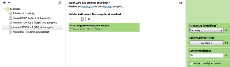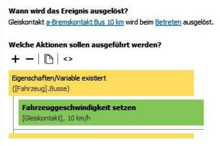 Hallo Wolfgang Ja, genau das war's: Hatte bei "Fahrzeuggeschwindigkeit setzen" irrtümlich als Auslöser den Gleiskontakt drin. Jetzt funktioniert alles 100% - auch in Verbindung mit den Zügen. Also nochmals besten Dank! Grüsse, Frenkyboy