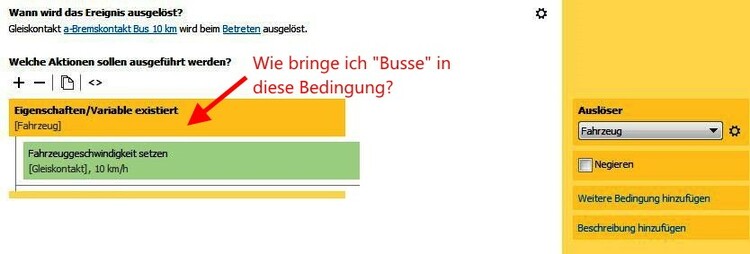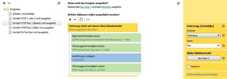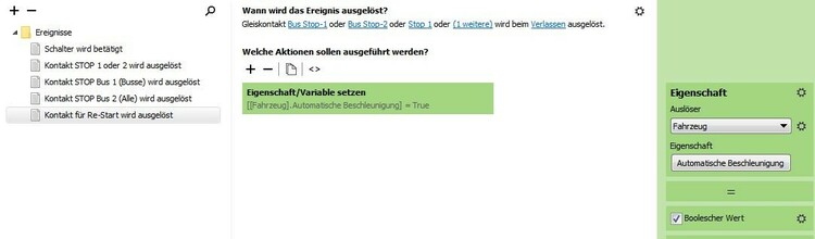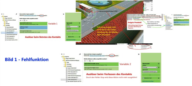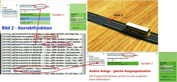 Guten Tag, Entwickler im Modellbahn-Studio Kennt jemand von Euch die Bedeutung/Entstehung der folgenden Fehlermeldung: "Unknown method or property name trackContact"? Ich habe das Problem bereits in meiner Steuerungs-Anfrage vom 24.07.2021 ("Strassenverkehr: Fehler beim Ausführen ...") vorgestellt, mich jedoch offenbar zu wenig verständlich ausgedrückt und daher keine Antwort erhalten. Ich versuche es daher nochmals andersrum: Bild 1 "Fehlfunktion": Fahrzeuge sollen an STOP-Kontakten kurz anhalten und dann weiterfahren, ohne nachfolgende Fahrzeuge über den STOP zu ziehen. Zu diesem Zweck wird die Variable 1 (automat. Beschleunigung = false) eingefügt. Dies löst aber die erwähnte Fehlermeldung (rot) aus und die Weiterfahrt stoppt. Ein Verlassen des Kontakts und damit Auslösung der Variablen 2 (automat. Beschleunigung = true) ist damit nicht möglich. Die Analyse des fehlerhaften Ereignisses im Ereignis-Protokoll zeigt nur ein unverdächtiges Bild der Variablen 1. Bild 2 "Korrektfunktion": Unerklärlich - in einer anderen Anlage mit praktisch gleicher STOP-Funktion schaltet die identische Programmierung einwandfrei: Mit der Variablen 1 stoppt der Bus und fährt nach kurzer Verzögerung problemlos weiter - ohne nachfolgende Fahrzeuge über den STOP zu ziehen. Genau so, wie es sein sollte! Wo ist denn der Unterschied zwischen den beiden Anlagen? Meine Folgerung: Wird die Variable 1 aus der Anlage "Fehlfunktion" entfernt, so funktionieren die STOPs normal - aber die Autokolonne wird langsam länger, da das Kopf-Fahrzeug die nachfolgenden Autos über den STOP zieht. Muss ich mich wohl damit abfinden? Pröbelt einmal in der beigefügten Anlage "Test 3 Albula neu". Findet jemand eine Lösung? Da wäre ich überglücklich! Ich habe diese Fragestellung auch noch in die Abteilung "Steuerung" gepostet - vielleicht hat einer der dortigen Experten doch noch eine Lösung für das Problem? Freundliche Grüsse und Dank für Eure Hilfestellung Frenkyboy Test-3 Albula neu.mbp- Strassenverkehr: Fehler beim Ausführen "automat. Beschleunigung ..."