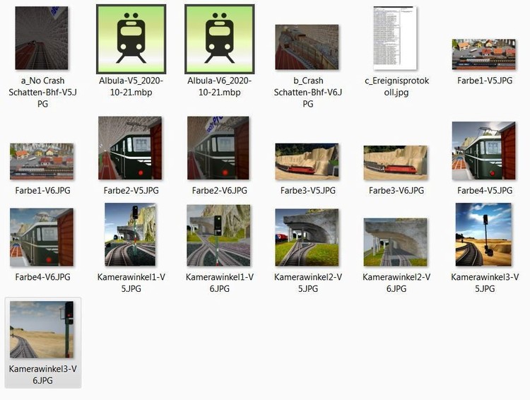 17. Guten Tag, liebe Entwickler Ich bin gerade mit der Erstellung einer neuen Anlage beschäftigt (Albula-V5 2020-10-21 in Version 5; noch nicht fertig ausgebaut) und habe nun vor einigen Tagen die Version 6 des 3D-MBS erworben. Aber leider mache ich folgende Beobachtungen: 1. Betrieb läuft sehr langsam/ruckelt (nur FPS ca. 14-26). In Version 5 normaler Lauf ohne Ruckeln (FPS ca. 28-55). Kann es am Computer liegen? (Spezifikationen: siehe Anhang). 2. Die Farben sind unbefriedigend matt und leicht neblig. Siehe hierzu 4 Beispiele - je Versionen 5 und 6 einander gegenübergestellt (vgl. Anhang) 3. Die Betrachtungswinkel bzw. Brennweiten der Führerstands-Kameras sind von Version 5 zu Version 6 deutlich verstellt - müssen sie manuell (soweit möglich) nachjustiert werden? (vgl. 3 Beispiele von V5/V6 im Anhang). 4. Während des Betriebs der Anlage in Version 6 wird im ersten Drittel in 95% der Fälle ein unerklärlicher Crash produziert: Ein aus dem Schattenbahnhof ausfahrender Zug dreht plötzlich um 180° und landet auf dem Parallelgleis in einem Gegenzug. In Version 5 ist dies nie passiert (vgl. Bilder im Anhang). Ich füge das Ereignis-Protokoll des Zeitraums bei, in welchem sich der Crash ereignet. Was läuft hier falsch in der neuen Version, welche doch über viele interessante Neuerungen verfügt? Muss ich notgedrungen bei Version 5 bleiben? Und dann habe ich noch eine Frage zur Steuerung im Modul "Strassenverkehr", welche ich weder in Version 5 noch in Version 6 schaffe. Ich stelle diese Frage in einem weiteren Thema in der entsprechenden Rubrik (siehe dort). Danke für Eure Stellungnahme, freundliche Grüsse - Frenkyboy Albula-V5 2020-10-21.mbp