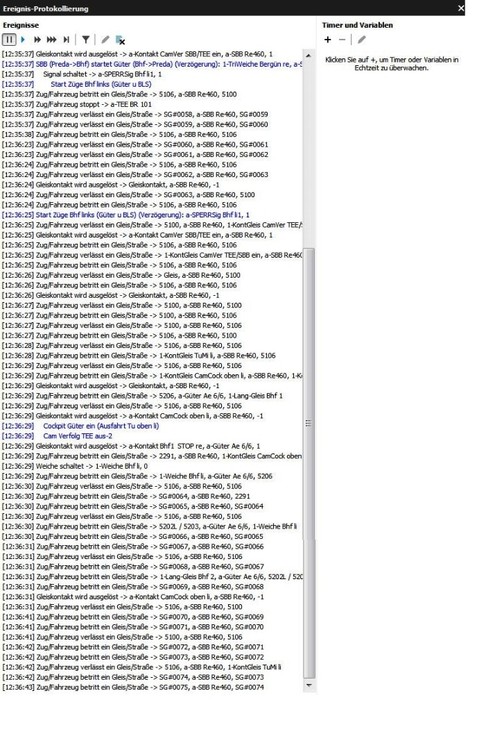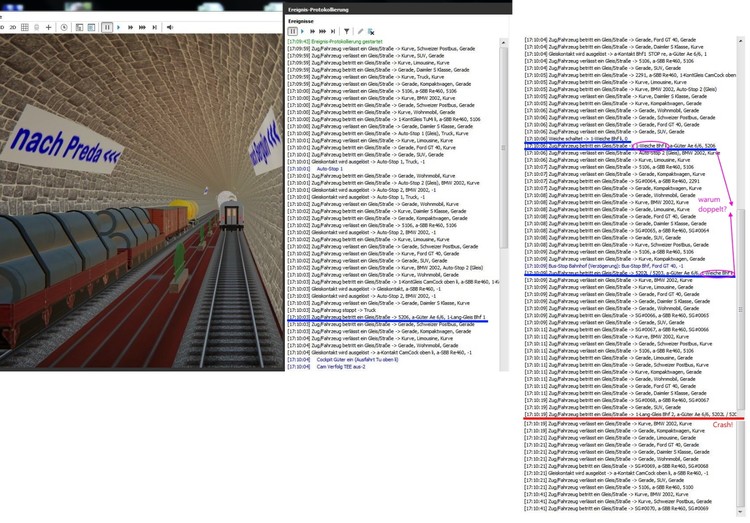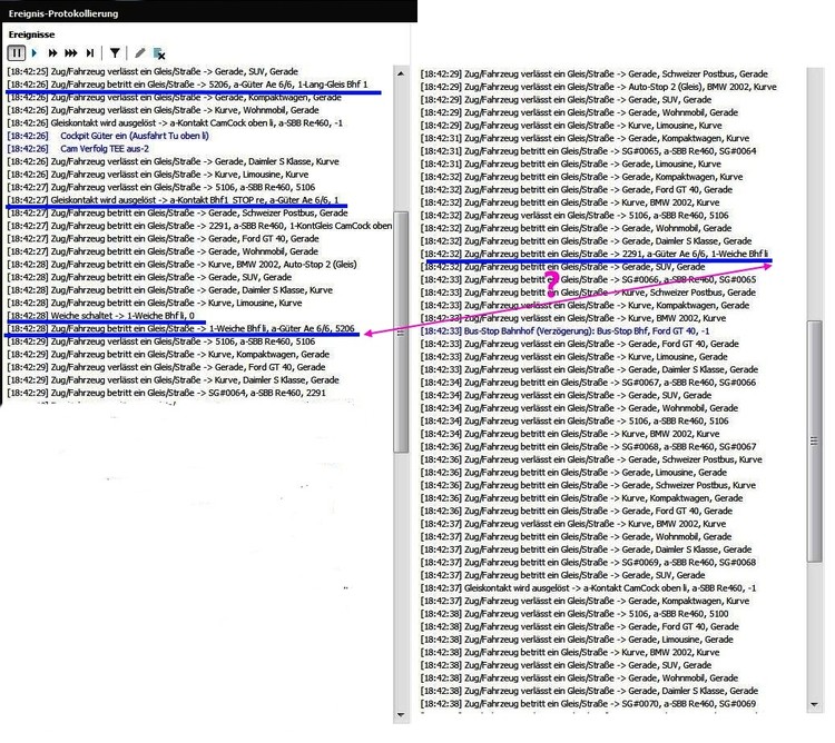 12. z.H. von Neo Guten Abend, Neo In Ergänzung meines gestrigen Beitrags "Enttäuschungen ..."sende ich noch zwei aktualisierte Screenshots zum beschriebenen Crash: Ereignisprotokolle Version 5 und Version 6, gleicher Ort und gleicher Zeitrahmen. Die Schlüsselstellen sind blau markiert - der unterschiedliche Ablauf von V5 zu V6 ist deutlich. Im EP Version 6 ist der Crash-Auslöser rot markiert: Die Güter-Lok dreht bei der Ausfahrt nach Preda unvermittelt um 180° und springt auf das Parallel-Gleis hinter den TEE-Zug, der sich in der Ausfahrt nach Bergün befindet. Damit kommt die ganze Steuerung durcheinander, und die Anlage hängt sich wenig später auf. Während der zahlreichen Testläufe ist es jedoch zweimal vorgekommen, dass der Crash nicht auftrat - der ganze Parcours wurde fehlerfrei absolviert. Dies macht vermutlich die Ursachenermittlung nicht einfacher. Ich hoffe, dass es gelingt, diesen Software-Fehler in V6 zu beheben - sonst werde ich mich wohl mit Version 5 zufriedengeben müssen. Freundliche Grüsse - Frenkyboy (PS. Ich habe diesen Beitrag ein zweitesmal verfasst, da offenbar bei der Uebermittlung etwas nicht geklappt hat - sorry.)