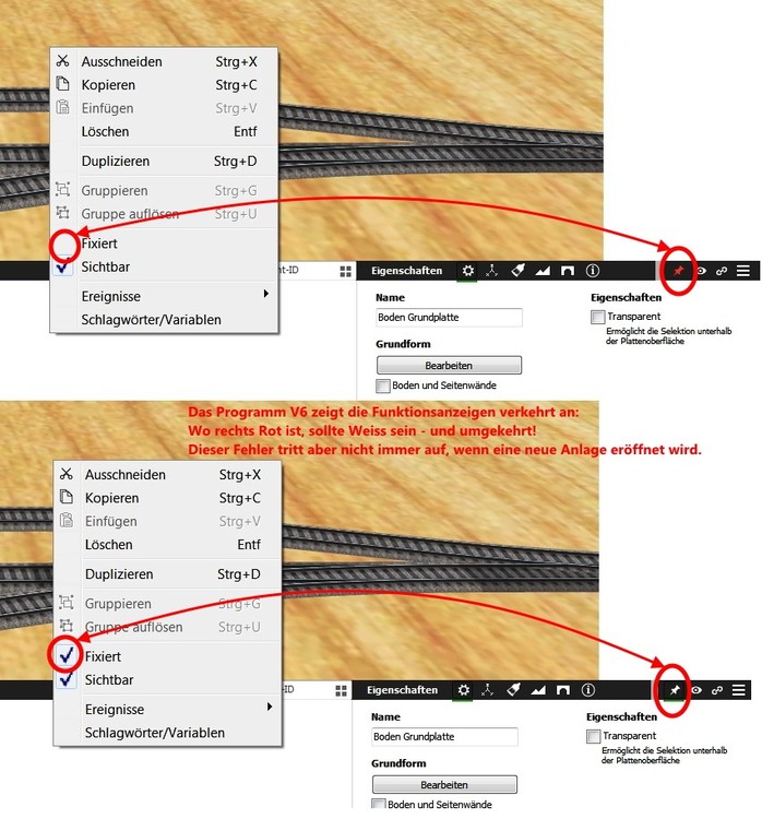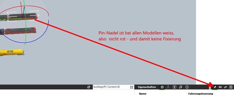 5. Mich laust der Affe! Ich habe wissentlich keine Modelle (Loks und Wagen) fixiert - siehe dazu den angehängten Screenshot! Ich habe alle Modelle einzeln überprüft. Die Pin-Nadel ist bei allen weiss - also keine Fixierung.