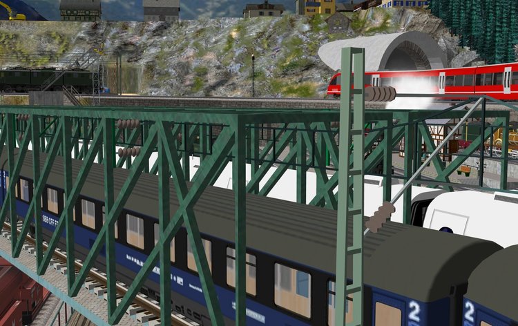 Hallo Leute, im Zuge der Anbringung der Oberleitungen ist mir aufgefallen, dass die Masten der Oberleitung für die Fachwerkbrücke BBS6180 zu hoch und zu ausladend sind (die würden dann quasi seitlich in der Luft stehen. Skalieren ist auch schwierig, weil dann passt der Fahrdraht nicht mehr. Also habe ich aus Bordmitteln einen Fahrdraht-Träger und einen eigenen Brückenfahrdraht gebaut. Die entsprechende Anlage ist hier, damit man sich die Teile holen kann. VGaÖ Vermanus OberleitungBrücke.mbp
