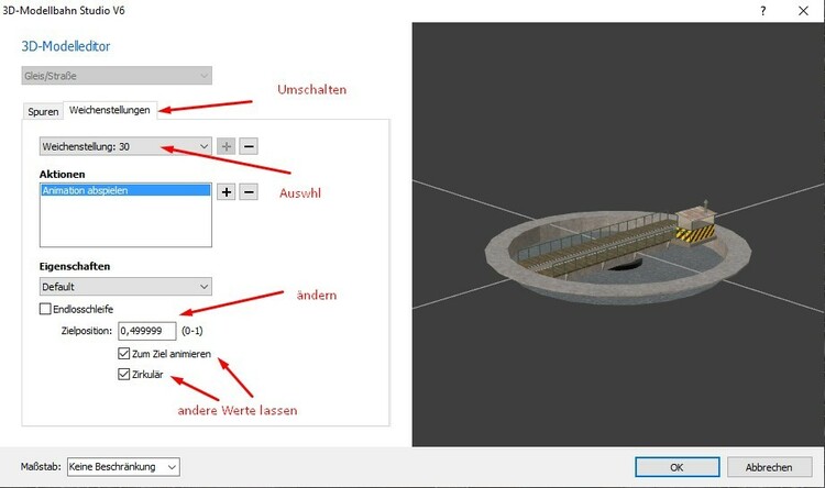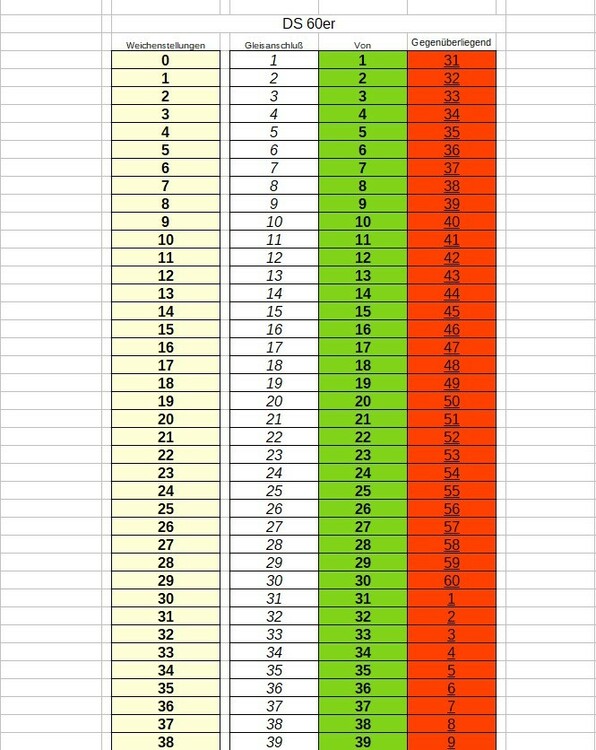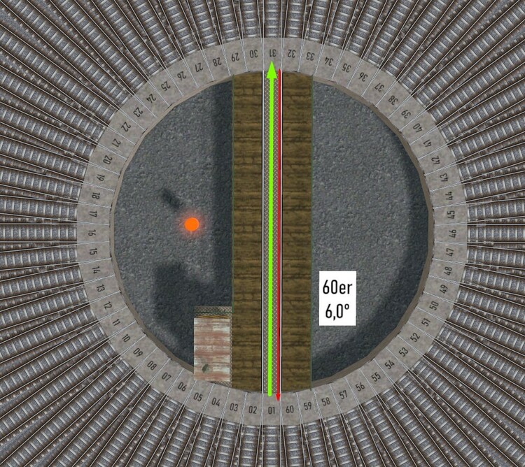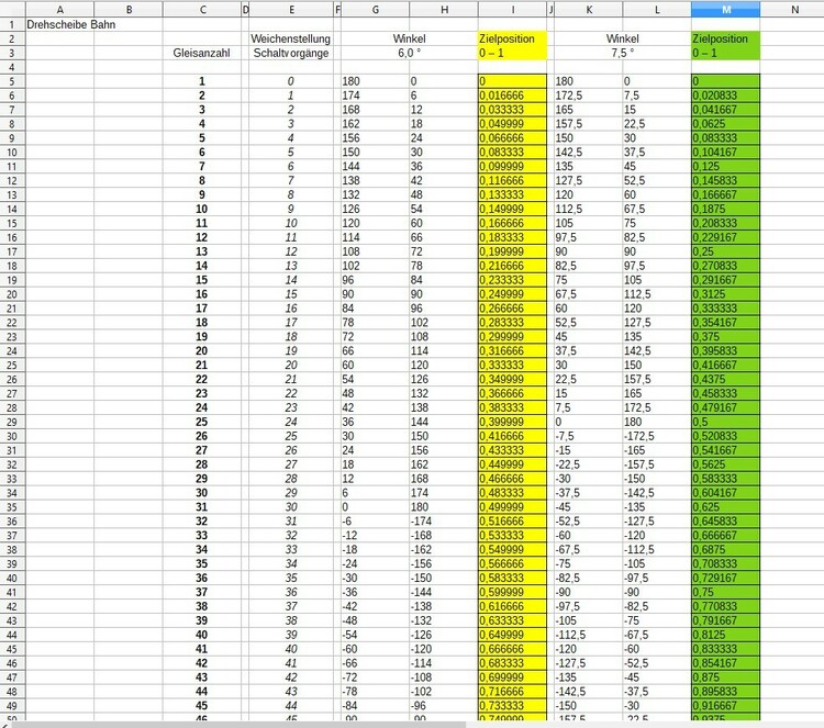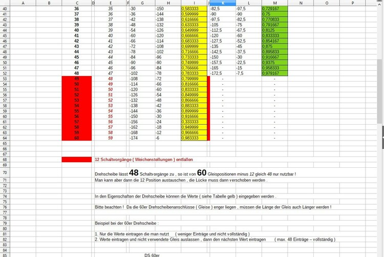 Hallo Modellbahnfreunde Drehscheibe nach Vorbild in Modell Im Katalog kann eine Drehscheibe heraus holen und sie entsprechend verändern in den Winkel . Dabei muss man in den Eigenschaften die Werte neu eingeben und mit RETURN/ENTER - Taste bestätigen . Die Schaltvorgänge also die Weichenstellungen sind nur bis max. 48 möglich . Man kann trotzdem eine 60er Drehscheibe aufbauen , man lässt dann die Werte aus die man nicht braucht . Ob eine Drehscheibe in Realen vollständig in Betrieb war kann ich nicht beantworten ( sicherlich nicht ) . Wichtig ist halt , dass das Gleis auf dem man auffährt zur Drehscheibenbrücke auch das gegenüberliegende Gleis bedenkt . Also beide Seiten der Drehbrücke ein Anschlußgleis befindet . Vorbereit für mich und als Beispiel : Hier ist eine Drehscheibe auf 6° Winkel aufgebaut und deren Nummerierung . Von der Drehscheibe-Kabine wird ausgegangen in welcher Position die Weichenstellung sich befindet . Gleis 0 fährt eine Lok auf die Drehscheibe-Brücke , sie soll um 180° gedreht werden , so kann die Lok auch wieder vorwärts auf Gleis 0 auffahren . Das ist der wichtigste Punkt , das eine Lok auch vom Gleis x wieder zurück fahren kann , ohne die Fahrkabine zu wechseln . Habe eine Tabelle aufgestellt mit den Werten der 48er und der 60er Drehscheibe . Hier sind die Angabe festgehalten die als Vergleich und der neuen Einträge der 60er gebraucht . Die Berechnung ist bis auf 60 Gleispositionen in der gelben Fläche gegeben , als Vergleich die 48 Gleispositionen . Rote Fläche bedeutet , dass 12 Weichenstellungen somit fehlen , da muss man ( volle 48 Werte ) die auslassen die man nicht eventuell nicht braucht . Oder man setzt nur die Werte die erforderlich sind ( keine volle Eingabe [ zB. 20 Anschlüsse von Gleise = 40 Schaltvorgänge bzw. Weichenstellungen ] ) . Hier zeige ich das Gleis und das gegenüberliegend Gleis in einer Tabelle . In meiner Anlage brauche ich 30 -32 Weichenstellung , da die Drehscheibe nur Halbrund bestückt ist . Lok fährt in einer festen Richtung ( vorwärts ) , durch das drehen kann die Lok auf die andere Anschlüsse fahren oder vom den Gleis kommend wieder zurück ( Lok behält die Fahrtrichtung bei ) . Vielleicht kann Neo noch eine kleine Erweiterung in der Weichenstellen herstellen , dann würde die 60er Drehscheibe voll genutzt . Wer Fragen hat , kann sie gern hier stellen , bedanke mich hier schonmal im Voraus ! Viele Grüße HnS
