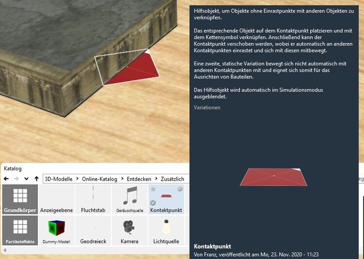 Geh es doch logisch an, Walter: Das entscheidende an einem Kontaktpunkt ist der Punkt in der Mitte. Das Drumherum ist nur da, weil man einen Punkt alleine nicht sehen und nicht anfassen kann. Also gehört der Punkt in der Mitte des _CP Objekts auf die Kante des Modells, wenn zwei Modelle mit ihren Kanten aneinander andocken sollen. Damit kannst du Möglichkeit 2 ausschließen. Bleibt die Frage der Ausrichtung. Um die herauszufinden, kannst du den Kontaktpunkt aus dem Katalog nehmen und an ein geeignetes Katalog-Modell andocken. Dann siehst du, wie die Ausrichtung bisher gehandhabt wird. Und diesen defacto Standard kannst du für dein Modell übernehmen. Ich hoffe, dass dir diese Erklärung ein wenig weiterhilft Götz