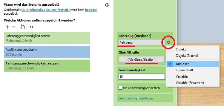 Hier ist ein Bild zu Andys Erklärung: Das Ereignis "Gleiskontakt wird betreten" hat zwei Auslöser. Denn zwei Objekte sind an diesem Ereignis beteiligt: der Kontakt, der betreten wird das Fahrzeug, welches den Kontakt betritt Deshalb muss man im Anschluss an die Auswahl "Auslöser" aus einer kleinen Liste den gewünschten Auslöser wählen. Und weil das Fahrzeug als Auslöser klar identifiziert ist, ist die Angabe eines bestimmten Gleises weder nötig noch sinnvoll.
