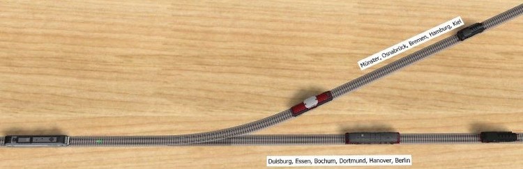 Ich will's versuchen. Für das Beispiel wähle ich Städtenamen (statt Zuggattungen) um eine Weiche umzuschalten. Einfach, weil das plakativer ist und mir schneller ein paar Städtenamen einfielen. Zuerst gibst du jeder Lok, die infrage kommt, eine Variable. Eine Variable ist einfach nur ein Speicherplatz, dem du einen Namen gibst. Den Namen darfst du dir frei ausdenken. Wichtig ist nur, dass alle Loks einen Speicherplatz mit demselben Namen bekommen! Ich nenne ihn in diesem Beispiel "Richtung". Denn an der entscheidenden Stelle werden wir jede Lok die "anklopft" fragen: "Was steht bei dir im Speicherplatz Richtung drin?". Vor dem Namen musst du noch den Informationstyp festlegen, den du speichern möchtest. Im Beispiel werden das Städtenamen sein. Das ist der Typ "Text". Deine Zuggattungen (Fern, Nah, Güter, Bau etc.) wären ebenfalls Text. Und wenn du die Text-Variable namens "Richtung" (oder "ZugGattung" oder "mein_Speicherplatz") erzeugt hast, gibst du als Text dein Unterscheidungsmerkmal ein. Bei mir ist das "Essen" oder "Hamburg" oder "Kiel" etc. Nun setzt du vor die Weiche einen Kontaktpunkt und bestimmst dann, was beim Überfahren des Kontaktpunkts passieren soll. Dabei benutzt du das, was in den Variablen der Loks steht, als Bedingung. Die Bedingung lautet also: "Eigenschaft/Variable besitzt den Wert" Rechts neben Variable klickst du auf das Zahnrad und wählst "Variable(erweitert)" aus. Die erweiterte Art benötigst du, weil du zwei Dinge angeben musst: wer hat die Variable (denn das ändert sich, je nachdem welcher Zug gerade über den Kontakt fährt.) wie heißt die Variable Auf dem zweiten Zahnrad wählst du nun "Auslöser", denn du willst etwas von demjenigen wissen, der gerade über den Kontakt gefahren ist und so dieses Ereignis ausgelöst hat. Es gibt zwei Auslöser: Den Gleiskontakt und das Fahrzeug, welches den Kontakt überfahren hat. Wähl mit dem kleinen Pfeil aus der Liste das Fahrzeug aus. Dann darunter (im Bild nicht sichtbar) den Namen der Variablen. Im Beispiel also "Richtung". Dann änderst du unter dem = Zeichen per Zahnrad den typ auf "Text" Und nun schreibst du eine Stadt (bzw. eine Zuggattung) in das Feld! (Im Beispiel oben steht "Münster") Für die übrigen Städte, welche dieselbe Weichenstellung benötigen, klickst du unten rechts auf "weitere Bedingungen hinzufügen. Im folgenden Fenster kannst du dann eine ganze Liste von Bedingungen erstellen. Und weil bis auf die Städtenamen alle gleich sind, geht es mit dem markierten Copy-Knopf besonders schnell. Du musst nur bei jeder Kopie eine andere Stadt eintragen. Aber- wie gesagt - nur die Städte (oder Zugattungen), welche dieselbe Richtung brauchen. Alle anderen musst du nicht aufzählen. Letzte Aktion: Achte unbedingt darauf, dass die Verbindung zwischen den einzelnen Bedingungen ein "oder" ist. Denn wenn ein Zug nach Münster oder Osnabrück oder Bremen oder Hamburg oder Kiel will, muss er nach Norden abbiegen. Alle anderen Städte fahren an dieser Weiche geradeaus. Die müssen nicht explizit genannt werden, denn geradeaus ist die Stellung für die Weiche, falls die oben genannten Bedingungen nicht erfüllt sind. Warum so viele Städte? Damit du dir vorstellen kannst, dass an der nächsten Weiche erneut sortiert wird. Zum Beispiel: "Duisburg oder Essen nach rechts, der Rest geradeaus ... Jetzt müsste dir theoretisch klar sein, was eine Variable ist. Sie ist einfach ein Platz, an dem man Informationen ablegen kann. Texte, Zahlen, Objekte … was auch immer man sich für später merken möchte. Diese Speicher heißen variablen, weil der Inhalt dieses Speichers geändert werden kann. Er ist also änderbar. Eben variabel. Entschuldigung: Natürlich habe ich Hannover falsch geschrieben. Sorry! Das ist herrlich naiv und kurzsichtig von dir. Ich mach das doch nicht nur für dich. Es gibt eine ganze Reihe User hier, die sagen: Ich muss das in Aktion sehen, sonst verstehe ich es nicht. Das Video muss (und möchte!) ich also trotzdem machen. Zug-Variable bestimmt Weichenstellung.mbp
