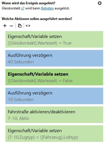 Genau so würde ich es machen: Setze gleich zu Beginn eine Variable "Wartezeit" (Typ Boolescher Wert) im Kontakt auf "True" dann eine Verzögerung von 40 Sekunden jetzt dieselbe Variable auf "False" setzen weitere 10 Sekunden Verzögerung und Abfahrt. Der Güterzug muss dann nur prüfen, ob die Wartezeit True oder False ist. Ist sie True, dann muss der Schnellzug mehr als 10 Sekunden warten. "Irgendwie" ist ein ganz schlechter Denkansatz. Denn gefühlt können gleiche Zeiten sehr verschieden lang wirken. Meines Erachtens ist das Studio völlig zuverlässig. Wenn du einen konkreten Fall hast, in dem es das nicht ist dann lohnt es sich, diesen Fall genau zu untersuchen. Misstrauen hilft nicht. Im Gegenteil führt das leicht zu Fehlinterpretationen. Und dazu, dass man eigene Fehler missachtet, weil man dem Studio die Schuld gibt. Viele Grüße Götz
