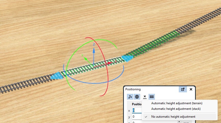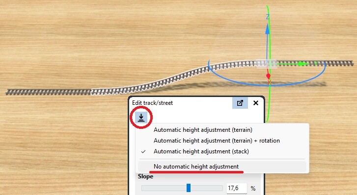 Hello Geoff, first select all track pieces that you want included in the slope now click on the blue triangle at the end which you want to raise or lower. a gismo appears in its place. Use the blue arrow to lift or lower this end. (A selected arrow changes to yellow, hence the different colour in the screenshot) Please let me know if this helped or if you'd like to get further explanations Goetz
