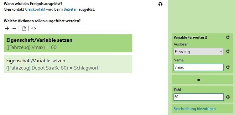 Hallo Hermann, das kannst du mit dem Befehl "Variable/Eigenschaft setzen" tun da du sowohl das Objekt als auch die Variable angeben musst, benötigst du die erweiterte Variable Achte beim Auslöser (für die Angabe des Zielobjekts) bitte darauf, von "Gleiskontakt" auf "Fahrzeug" umzuschalten! Das Schlagwort (für den zweiten Befehl) findest du über das Zahnrad unter den Typen. Viele Grüße Götz