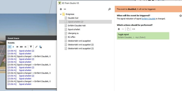 8. Hi Kutscher Das ereigniss "signal schaltet(2)" wird permanent ausgeloest, konnte keinen timer finden abba wenn man es deaktiviert kann man die lok anhalten. Ich schaue noch ein wenig ob ichs finde was das ausloest abba muss auch demnaechst in die kiste, ist ja schon mitternacht. Cheers Tom