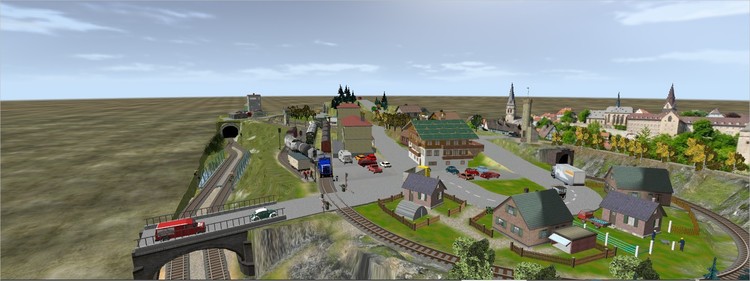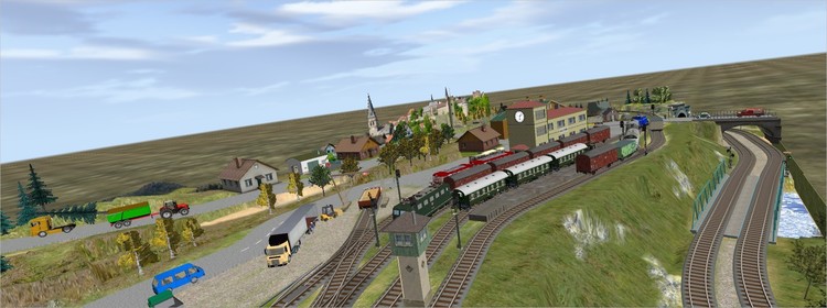 Hallo Freunde, nachdem ich euch am 20.September mein letztes Vorhaben zur Trilogie "Dorf und Eisenbahn in Bildern vorgestellt habe, kann ich nun die fertige Anlage einschließlich EV veröffentlichen. Wie fast immer, war es eine kleine Schinderei, einen unfallfreien Zugverkehr hinzukriegen. Insbesondere musste der Rangierbetrieb in Abhängigkeit von den P-und G-Zügen genau getimet werden. Und, was dazu kommt, ich mache es mir selbst eigentlich schwieriger als notwendig, weil ich mir keinen Zettel und Bleistift nehme, um die jeweiligen Abhängigkeiten verschiedener Ereignisse in der EV zunotieren. Ich möchte also mit Absicht mein Gehirn anstrengen, weil man (hoffentlich) nicht so schnell verkalkt. Ist übrigens auch ein schöner Effekt des MBS, dass das logische Denken gefordert und gefördert wird. Noch ein paar Bemerkungen zur Anlage: Mit ihren Abmassen zeigt sich erneut, dass es auf kleinem Raum möglich ist, relativ große Gleislängen und damit auch einen gutes Verhältnis von Parade- und unsichtbaren Streckenteilen zu erreichen. Wer es noch filigraner haben möchte, kann statt der genutzten Märklin-K-Gleise auf kleinere Spurweite zurückgreifen. Obwohl es kaum Animationen gibt und ich auf "endlosen" Straßenverkehr verzichtet habe - mit Ausnahme der LKW's, die die Ladung des rangierten Waggons übernehmen, sollte auch so nicht vorschnell Langeweile aufkommen. Und ich könnte mir auch vorstellen, dass Dorndorf auch jemanden anregt, es als reale Anlage zu bauen. Dann also Vorsicht an der Bahnsteigkante bei Abfahrt des Zuges Streitross Kleinanlage Dorndorf.mbp