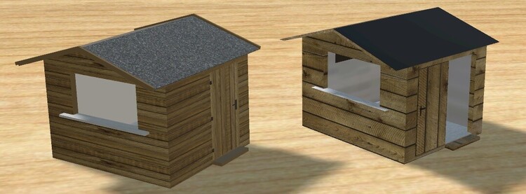 Hallo @RoniHB , wie oben schon geschrieben habe ich vom Modell Kiosk keine Dateien mehr. Dir nicht helfen zu können hat mir dann keine Ruhe gelassen. Ergebnis aus alt mach neu: Im Bild links das neue Modell. Gegenüber zum alten Modell habe ich die Holztextur in der Höhe verringert, das Seitenfenster entfernt, dem Dach habe ich eine neue Textur verpasst und die Tür lässt sich endlich bewegen. Durch auf/abrunden der Aussenmaße ist das neue Gebäude trotzdem ziemlich gleich dem älteren Modell geblieben. Das grüne Häkchen ist auch vorhanden. Metallic- und Roughness-Textur fehlt noch von meiner Seite. Wenn du das Modell auf einer privaten Anlage platzieren möchtest, kann ich dir das Modell zu kommen lassen. Gruß Karl