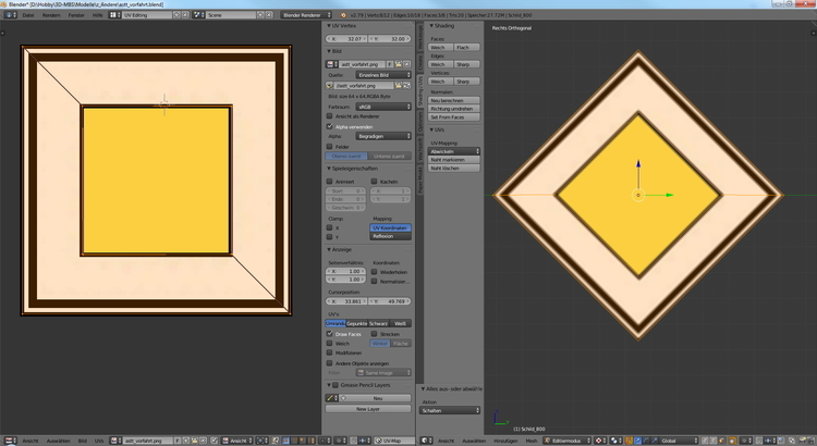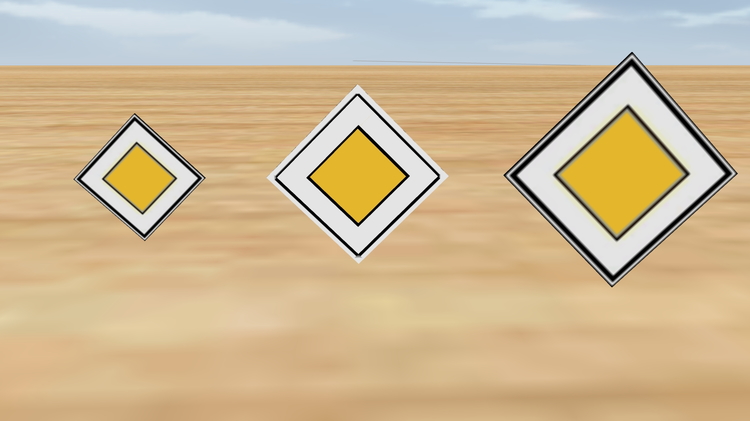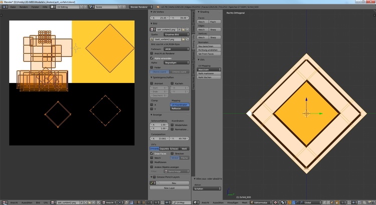 5. Hallo astt, Der Effekt kommt wohl daher, dass als Textur eine Pixelgrafik (BMP, PNG, JPG, u.ä.) zum Einsatz kommt. Habe mal mit Gimp (PNG) und Blender experimentiert (3 Größen: 420, 600 und 800 mm). Bei diesem Verkehrszeichen ist es noch ein Leichtes, die Grafik um 45° zu drehen, sodass es nur waagerechte und senkrechte Konturen gibt. Habe zusätzlich beim 800er ein inneres Viereck ausgeschnitten: Ergebnis im MBS: "Richtig scharfkantig" (Mitte) wird es nur mit deutlich mehr Aufwand: Hier sind alle farbigen Bereiche aufgeteilt in einzelne Flächen (zugegeben etwas unsauber auf die Schnelle). Jedoch zu welchem "Preis" und mit welchem Aufwand: (Eckpunkte - Flächen - Dreiecke) kleines Schild 8 - 6 - 12 großes Schild: 12 - 8 - 20 mittleres Schild: 128 - 126 - 252 Bei einem solch einfachen Schild vllt noch machbar - wie groß soll aber der Aufwand für ein aufwendiges Zeichen werden? Gruß ShPaul