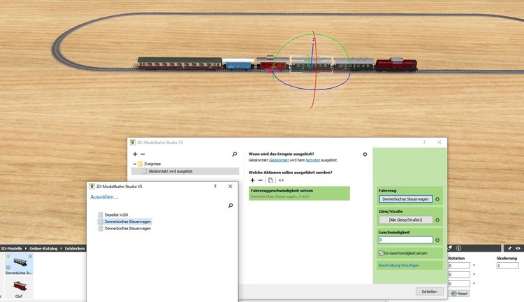 Hallo, ich spiele gerade so etwas mit V5 herum und teste die neuen Möglichkeiten aus. Dabei bin ich beim Thema Gleiskontakt auf etwas gestoßen (siehe angehängtes Bild). Warum werden mir bei der Fahrzeugauswahl die Diesellok und die beiden Donnerbüchsen angeboten (ich kann die Donnerbüchsen einerseits auswählen, aber sie bewirken andererseits keine Funktion), die anderen Wagen aber nicht. Hat da jemand eine Idee? Gruß, Michael- Vorstellung neuer Mitglieder