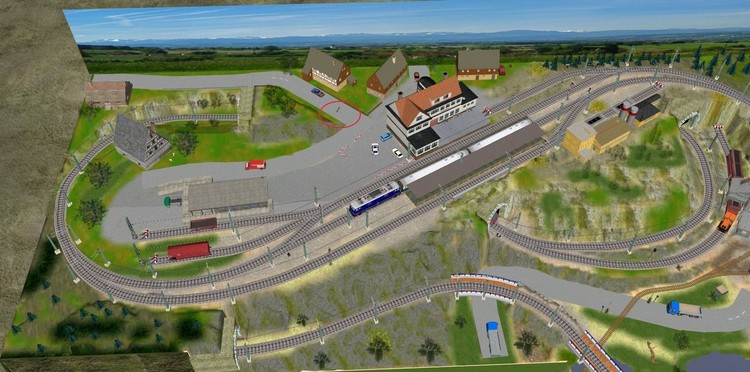 Hallo Streitross, eine schöne kleine Anlage! Die gefällt mir wirklich, da ist der gesamte Platz ausgenutzt und mit viel Phantasie hast Du da die Landschaft gestaltet. Nur eine kleine Anpassung solltest Du noch vornehmen, um es perfekt zu machen. Ich habe Dir einen Screenshot Deiner Anlage angefügt, in dem roten Kreis... an der Stelle stoßen die Stromabnehmer der E-Loks durch die Straße. Vielleicht ist's ja nur wenig Aufwand. Gruß, Michael