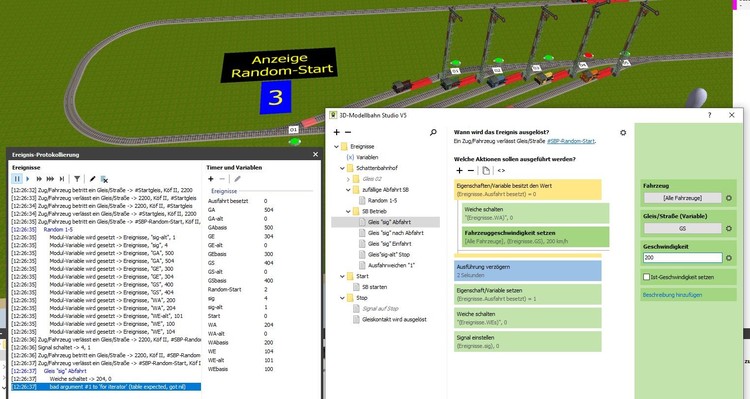 Hallo in die Runde, ich habe ein kleines Problem (wieder mal). Bei meinem Schattenbahnhof hatte ich alles so für jedes Gleis einzeln in der EV geschaltet und habe mir gedacht, daß das ja auch alles viel einfacher gehen müßte und versuchte das jetzt alles mit Variablen anstatt alles x-mal zu schreiben. Die Weiche 204 (Varaible WA hat den Wert 204) schaltet, das Signal 4 (Variable sig hat den Wert 4) schaltet. Die Lok, die auf dem Gleis 404 (Variable GS hat den Wert 404) fährt aber NICHT los, der Ablauf bricht mit der Meldung bad argument #1 to 'for iterator' (table expected, got nil) ab. Ich weiß nicht (ist aber wahrscheinlich), daß in der EV noch mehr Fehler sind, aber erst muß der gefunden werden, sonst gehts ja nicht weiter mit dem testen.... HILFE!!!!!!!!!!!!! langsam aufgebend, Michael SB.mbp