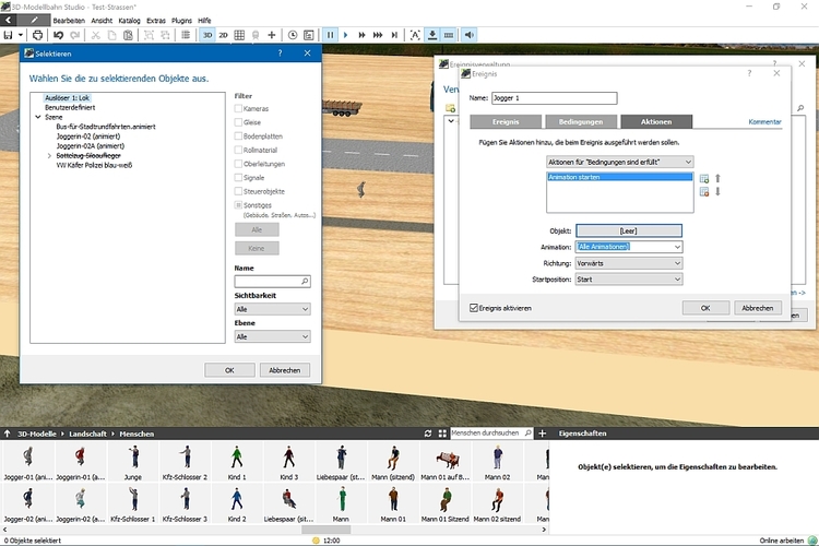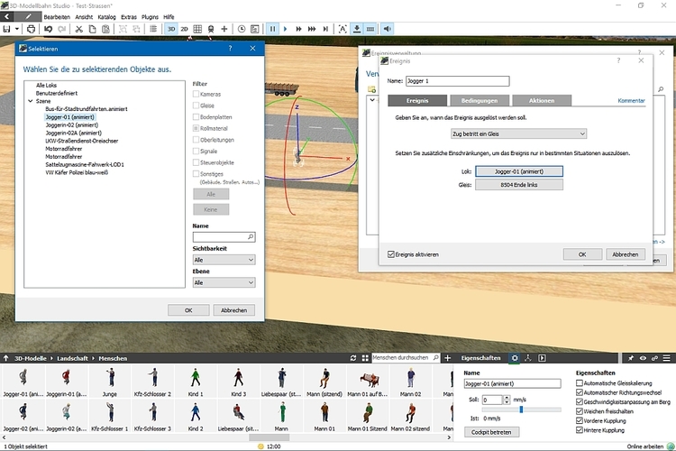 Hallo Eckhard, danke für Deine schnelle Info. Ich habe mir das zwar ein bisschen anders vorgestellt, aber wenn es nicht anders geht, muss ich es auch so machen. Ich habe gehofft, dass man den Jogger auf dem Laufgleis umdrehen kann wenn er sein Ziel erreicht hat. Ich könnte mir dann denn Kreis am Ende, aus Platzgründen, sparen. Übrigens, es gibt in meiner Datenbank nur einen Jogger denn man mit der EV steuern kann. Hier ein Beispiel: Jogger-01 kann man als Ereignis auswählen (siehe Bild-1). Bei den Aktionen wird der Jogger-01 nicht mehr angezeigt (siehe Bild-2). Ist das Richtig oder mach ich da etwas falsch. Nur bei der Joggerin-02 funktioniert alles. Weiterhin einen schönen Sontag Mit freundlichen Grüßen Detlev2