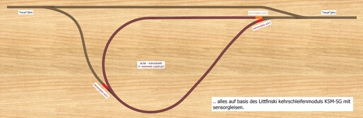 11. .. jetzt komme ich - dank eurer hilfe - immer besser klar; eine frage die nicht direkt mit der software zusammenhängt hat sich grade noch aufgetan während des tüftelns - vielleicht hat ja jemand zeit und lust, sie mir zu beantworten: .. also - geht eine kehrschleife gemäss abbildung mit sensorgleisen auch (sonst wird sie mir zu kurz)? dunkelrot wäre die schleife und das orangene und gelbe sensorgleis wären parallel geschaltet. am roten und orangenen liegt konstant gleiche polung vor. tja, eh ich schon wieder - und lg!