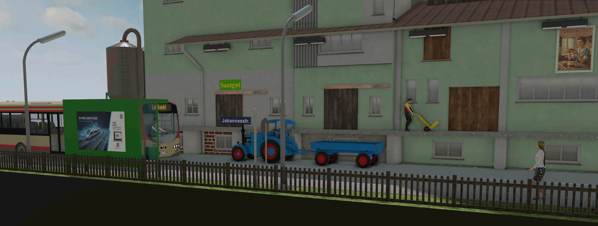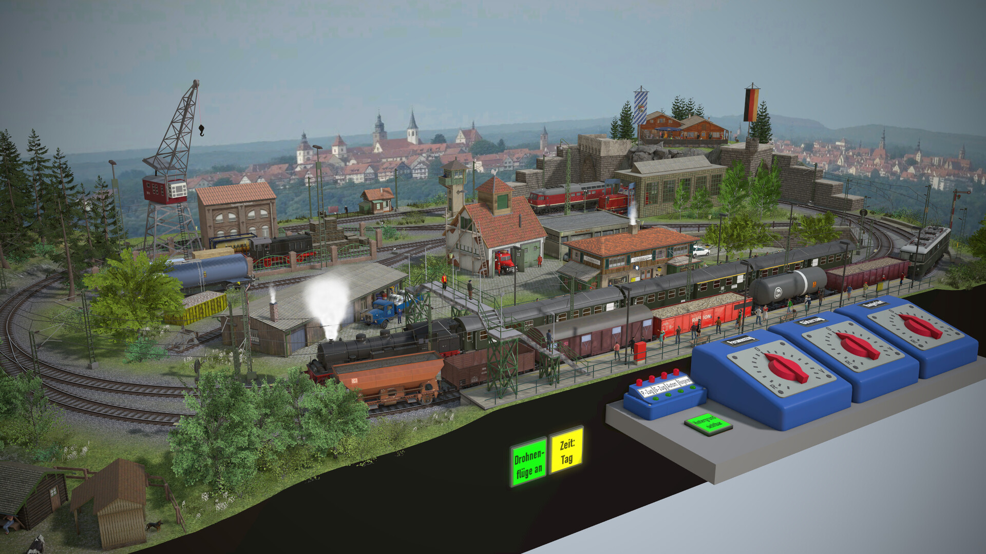 Hallo zusammen, neue Programmversion bedeutet neue Version der Historischen Anlage 01. Folgende Dinge wurden geändert/ergänzt.: Andere Hintergrund-Kulisse, die jetzt besser zum Thema passt. Komplette Überarbeitung der Vegetation. Verbesserte Tetxurierung der Bodenplatte. Neuer Schalter "Drohnenflüge an/aus". Wenn der Schalter "Drohnenflüge an/aus" grün leuchtet, folgt die Kamera als Drohnenflug der aktuellen Lok. Das gilt auch für die Rangierfahrten. Wenn die Automatik für die Ringstrecke aktiviert ist, sind die Drohnenflüge dort deaktiviert. So können bei automatischem Ringstreckenbetrieb gleichzeitig Verfolgungen bei den Rangierfahrten stattfinden. Es ist faszinierend, welche Kameraeinstellungen und grafischen Effekte @Neo in die neue Programmversion implementiert hat. Deshalb an dieser Stelle ganz herzlichen Dank an Neo. Interessant wird es auch, wenn man zum ersten Eintrag in diesem Thread springt. Dann wird sichtbar, welche enormen Verbesserungen das Programm in diesem Zeitraum erfahren hat. HG Brummi ID der geänderten Anlage: 639864FB-BD7D-4F98-B5B7-455176D54261