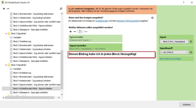 Hallo Bahnland, die innere Blockstrecke habe ich in V4 wie folgt erstellt. 1. neue Anlage erstellen. 2.Bearbeiten, Einfügen aus, Anlage V4 Block Spur N Formsignal rechts dabei wird die EV mit erstellt. 3.Die EV öffnen und unter Ereignisse eine neue Gruppe erstellen und die 7 Ereignisse hineinpacken 4.Für jeden Block Punkt 2 und 3 wiederholen und fortlaufende NR vergeben, dabei wird die EV immer erweitert. Blockgruppen zusammenfügen und die EV bearbeiten, bei jedem Block nur unter Ausfahrt blockieren das zweite Signal auswählen Bei dieser Arbeitsweise muss ich immer nur das Signal des Folgeblocks wählen, das funktioniert aber mit deinem neuen Baustein nicht. Gruß Hermann