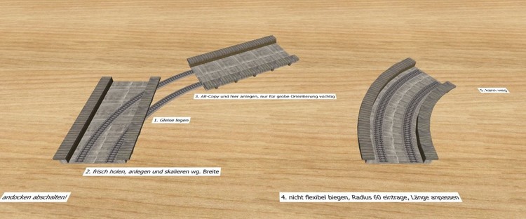 Hallo @pfjoh, also die Vorgehensweise müßte also so sein: Du nimmst Deine Vorflutbrücke und schneidest sie in der Länge dort ab, wo das kleine Holzstück endet, also an der nächsten Geländerstrebe. Das speicherst Du mit dem Exporter als x-Datei ab. Dann gehst Du in MBS hin, Katalog->3D-Modelle->Neu Anwahl von Gleis/Straße. Dann gehst Du auf + und lädst Dein Modell rein. Dann klappst Du dort wo Dein Modellname steht auf und löschst 'Mit Bettung' und 'ohne Bettung'. (jeweils mit -) Dann gehst Du auf Spuren und schaltest von Bahn auf 'Nur 3D-Modell'. Kannst in den Dimensionen noch ein wenig anpassen und gehst am Ende auf Speichern. Jetzt hast Du im 'Meine 3D-Modelle'-Ordner eine splinefähige Brücke! Ganz rund wird die aber nicht sein, sondern sie knickt immer ein wenig am Ende Deines Segmentstückes. Also - so habe ich's jedenfalls verstanden, und so klappt's auch mit meinem Cube. Ich frage mich jetzt nur, warum unsere Grundkörper nicht auch als Splines vorliegen. Grüße Andy- Frage an die Spezialisten