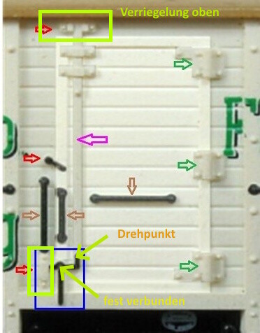 Hallo @BahnLand , ich sehe das genauso wie @Roter Brummer. Ich habe mal versucht das im Bild zu kennzeichnen. der untere Hebel ist also in einem Stück und in sich nicht beweglicht, lässt sich aber im Drehpunkt entgegen dem Uhrzeigersinn drehen. Dadurch wird die untere Veriegelung geöffnet und die obere Verriegelung rutscht nach unten, wenn es nicht klemmt . Dann kann die Tür geöffnet werden. LG Ronald