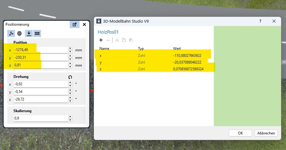 Hat sich erledigt liebe Leute, ich muss irgendwie im ersten Versuch einen Tippfehler gehabt haben. jetzt gehts. --[[ Positionen der Holzstapel merken --]] -- Holzstapel 01 $("Ereignisse").variables["HolzPos01"] = $("Holz_01").transformation.position $("Ereignisse").variables["HolzRot01"] = $("Holz_01").transformation.rotation -- Holzstapel 02 $("Ereignisse").variables["HolzPos02"] = $("Holz_02").transformation.position $("Ereignisse").variables["HolzRot02"] = $("Holz_02").transformation.rotation -[[ Holz zurück zum Ladeplatz beamen --]] -- Holzstapel 01 $("Holz_01").transformation.position = $("Ereignisse").variables["HolzPos01"] $("Holz_01").transformation.rotation = $("Ereignisse").variables["HolzRot01"] $("Holz_01").link = nil -- Holzstapel 02 $("Holz_02").transformation.position = $("Ereignisse").variables["HolzPos02"] $("Holz_02").transformation.rotation = $("Ereignisse").variables["HolzRot02"] $("Holz_02").link = nil trotzdem bleibt die Frage, warum die Werte nicht denen, die im Positionsfenster zu sehen sind entsprechen. LG Ronald