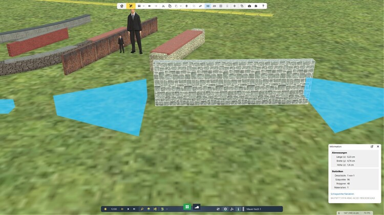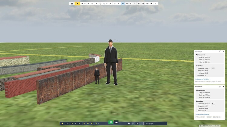 Hallo @EASY, Danke für den Tipp. Aber in Blender hab Ich die Einstellungen. die Du erwähnst. Beim Import verwende Ich 1:87 (HO) cm. Das währen dann 80cm in echt. Ich hab mal eine 2 Person daneben gestellt dann ist es etwas besser Sichtbar. Das die Mauer nicht zu klein ist. Mein Angabe war wohl etwas Irreführend. Gruß Christian