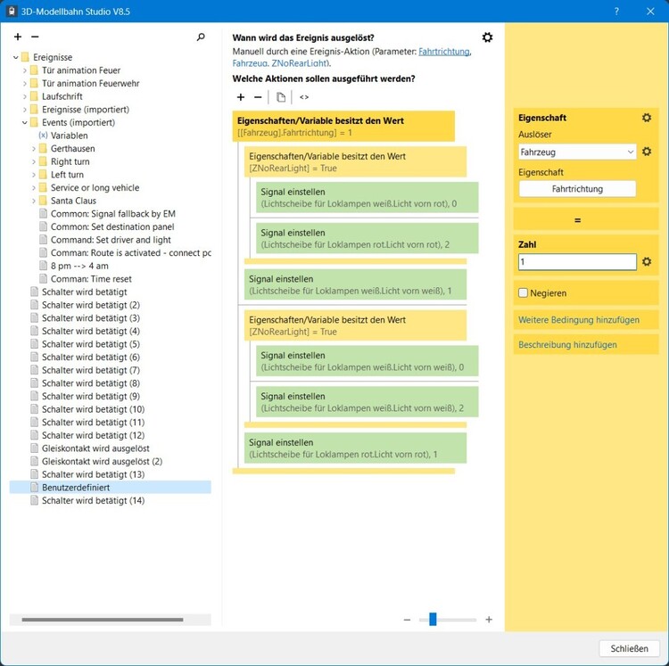 Hallo, Ich möchte bei einem Modell das keine Animation besitzt mit Grundkörpern einen Lichtwechsel realisieren und per EV steuern. Und zwar per Fahrtrichtung. Wenn das Fahrzeug vorwärts fährt dann soll es weiß leuchten und bei Rückwärtsfahrt dann eben rot. Realisieren wollte Ich es mit Unsichtbar und Sichtbar schalten der jeweiligen "Lampen". Hab schon ein paar Aktion probiert aber nichts hat funktioniert. Deshalb hab die entsprechenden Einträge gelöscht und somit von 0 anfangen. Hab mal ein kurzes Video erstellt. In dem Video hab Ich es mit einem Schalter realisiert. Damit man es vielleicht besser versteht was Ich meine. https://drive.google.com/file/d/1rUPIueHESK6EyEcp1UM0Fyv8pwa43nVf/view?usp=drive_link Gruß Christian